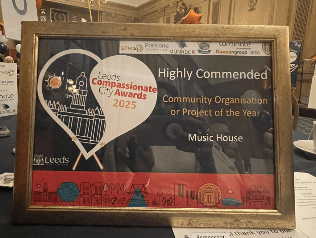 Music House is thrilled to have been recognised at this year’s Leeds Compassionate City Awards, which celebrate the individuals and organisations making a real difference across Leeds. Taking place on Thursday 6 November, the awards shine a light on the everyday work of people and community groups who make the city a better place to live, work and visit.